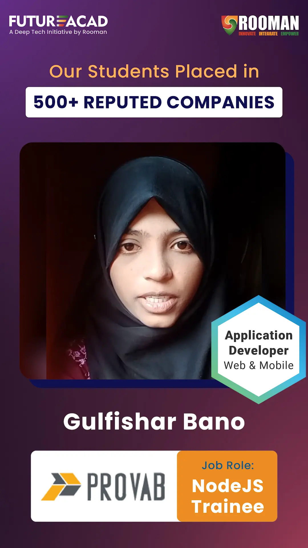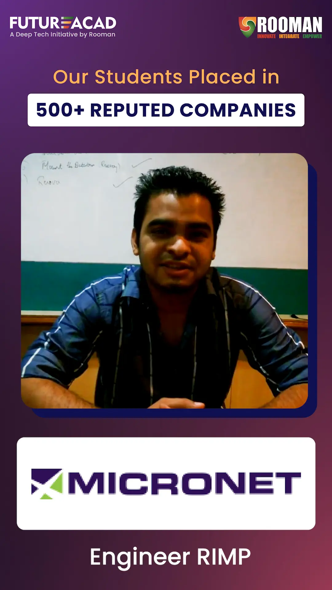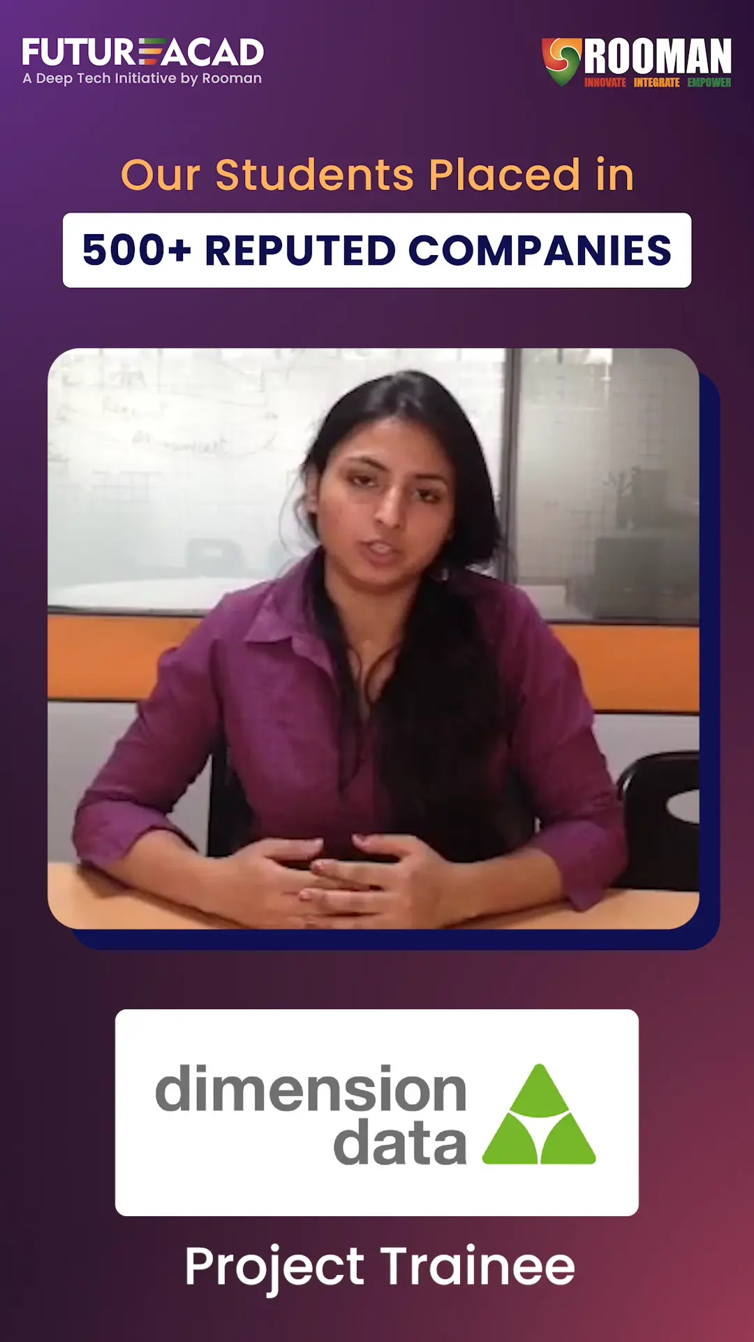 At FutureAcad – A Deep Tech Initiative by ROOMAN, we take pride in enabling measurable career outcomes. Our students have secured prestigious roles across 500+ leading Fortune companies, a testament to our rigorous training methodologies, industry-aligned curriculum, and results-driven placement support. Explore the success stories that reflect our institutional credibility and commitment to workforce readiness.